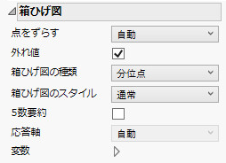 は、外れ値または分位点の箱ひげ図を表示します。箱ひげ図は、値の分布を簡潔に表示したものです。箱ひげ図は、変数が数値データタイプである場合に便利です。外れ値と分位点の箱ひげ図の詳細については、『基本的な統計分析』の「一変量の分布」章を参照してください。