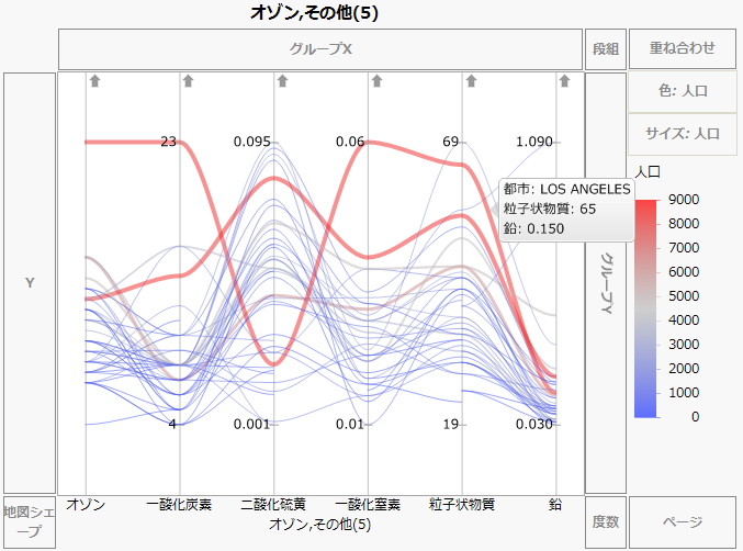 「Cities.jmp」の汚染データのパラレルプロットは、「Cities.jmp」データテーブルにある6つの変数のパラレルプロットを示しています。「人口」変数は、「色」と「サイズ」の変数として使用されています。「Los Angeles」の曲線のラベルが表示されています。