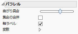 「Cities.jmp」の汚染データのパラレルプロットを見ると、「一酸化炭素」と「粒子状物質」のスケールが他の変数のスケールと大きく異なっています。測定した変数間でスケールが大きく異なる場合は、この方法で表示すると、違いがはっきりとわかります。