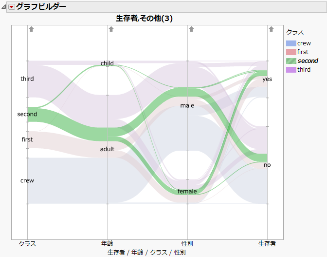 「Titanic.jmp」を使用したカテゴリカル変数の帯の例では、クラス2(二等船室)のすべての乗客を含む帯が選択されています。このパラレルプロットから、ほとんどが成人であったこと、女性より男性の方が多かったこと、および生存者の方が非生存者よりわずかに少ないことがわかります。
