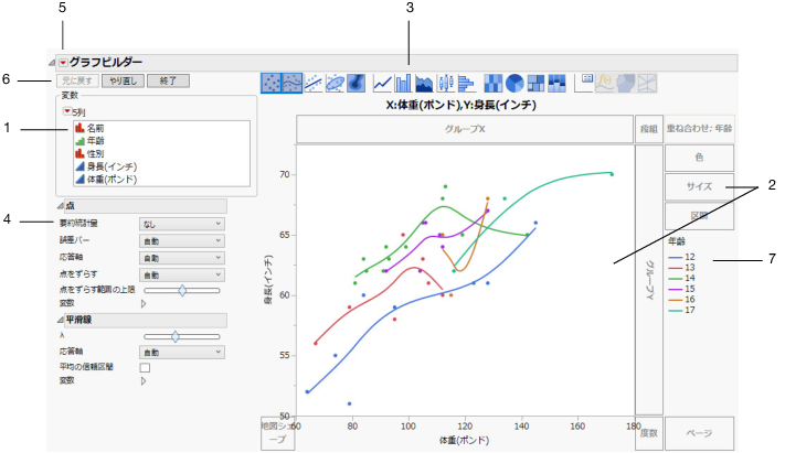 「Big Class.jmp」の「グラフビルダー」ウィンドウのグラフを作成および変更するには、以下の手順で操作します。