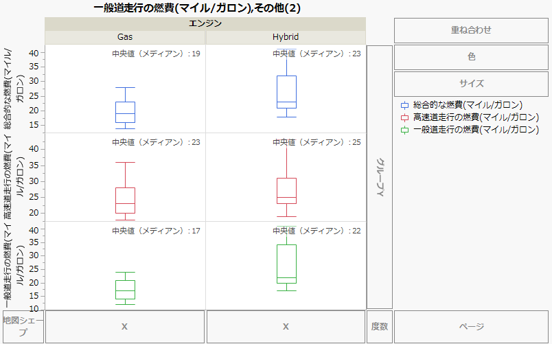 プロットの左側にある[キャプションボックス]オプションで、「一般道走行の燃費(マイル/ガロン)」、「高速道走行の燃費(マイル/ガロン)」、「総合的な燃費(マイル/ガロン)」について「要約統計量」リストで[中央値(メディアン)]を選択します。