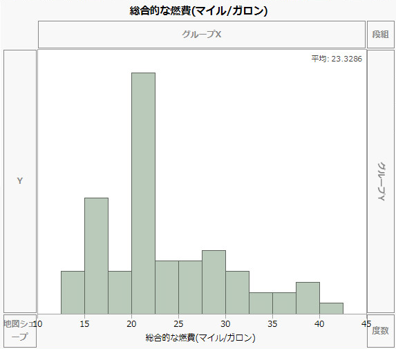 ヒストグラムを縦に表示したいので、「総合的な燃費(マイル/ガロン)」を「X」ゾーンに移動させます。