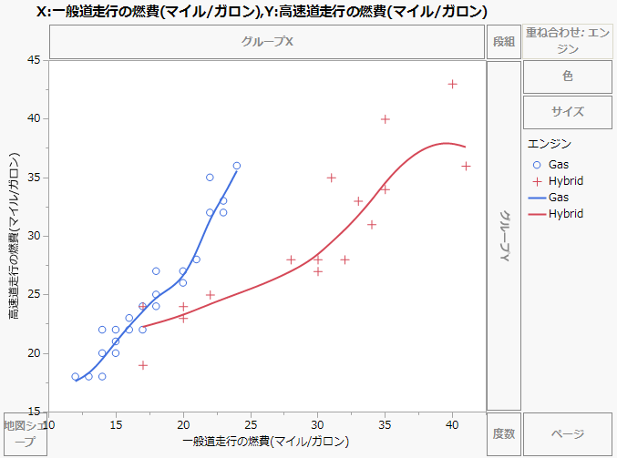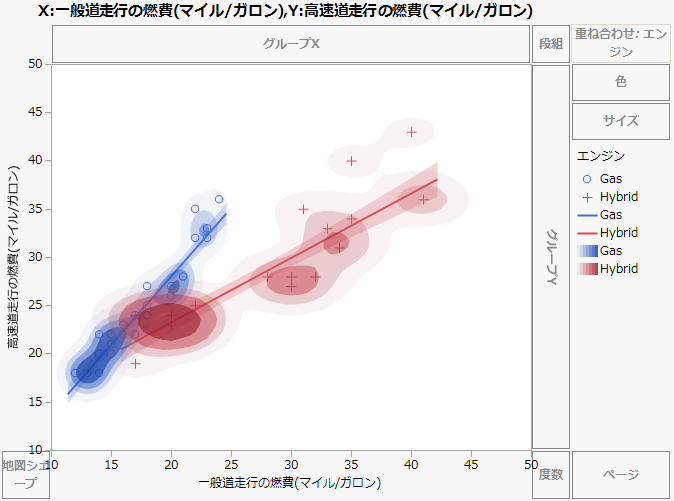 [ヘルプ]>[サンプルデータライブラリ]を選択し、「Hybrid Fuel Economy.jmp」を開きます。