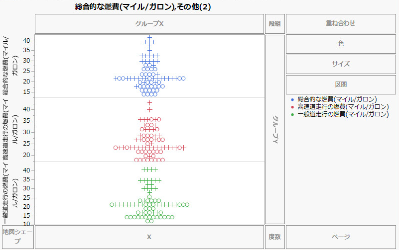 データテーブルの行にはマーカーが割り当てられているため、点はそれらのマーカーで表されます。各行の「総合的な燃費(マイル/ガロン)」の値は縦軸の該当する値の位置にプロットされます。同じ「総合的な燃費(マイル/ガロン)」値のオブザベーションに対応する点が重なってプロットされないように、それらの点は自動的にずらして表示されます。