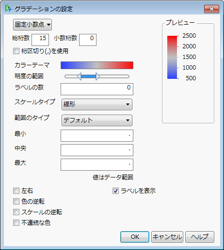凡例のラベルの表示形式を設定するには、ウィンドウの左上にあるメニュー、「総桁数」ボックスと「小数桁数」ボックス、および[桁区切り(,)を使用]チェックボックスを使用します。