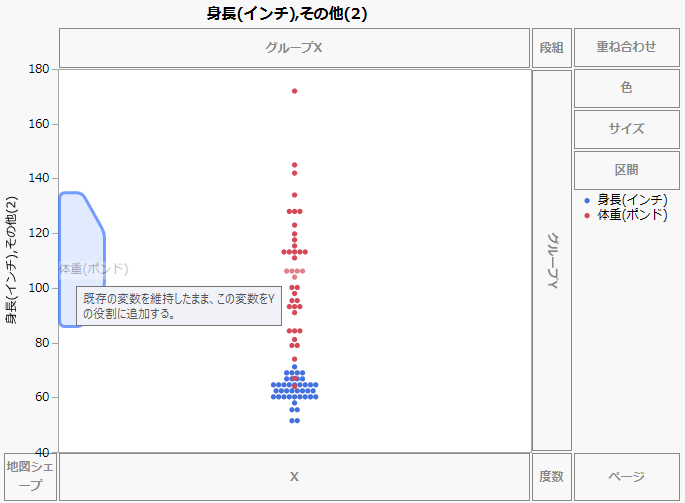 ゾーン内にすでに変数があり、さらに変数を追加したい場合は、新しい変数をゾーンより内側のグラフエリアにドラッグし、ゾーンの内側に左右対称な多角形が表示されたところでドロップします。