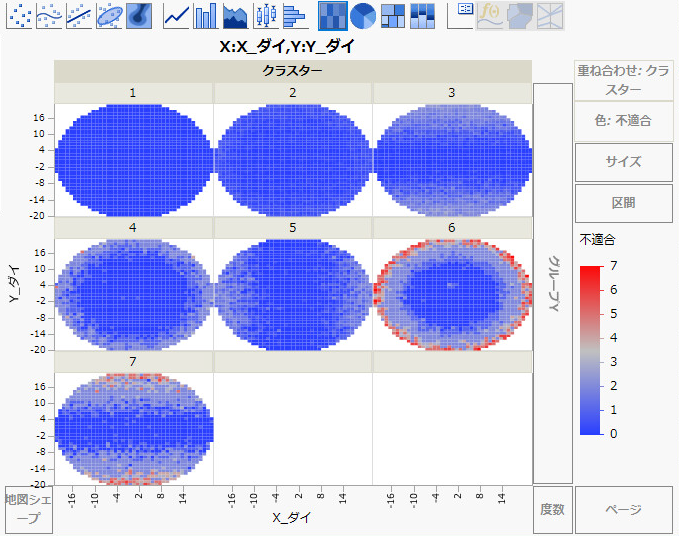 この例では、ウエハーに関する不適合データを取り扱います。「X_ダイ」および「Y_ダイ」列にはダイ上の位置、「不適合」列には各位置における不適合の数が含まれています。ダイの不適合は一定のパターンで発生することが多いため、ここではクラスター分析を使用してウエハーを同じような不適合パターンのグループに分けます。その後、各クラスターの不適合パターンを視覚化します。