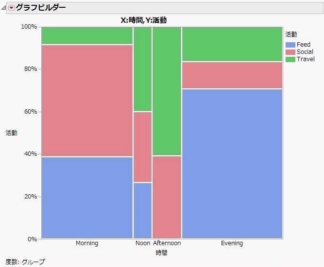 この例では、時間帯とイルカの活動との間に関係があるかどうかを調べてみましょう。データは、「活動」と「時間」(時間帯)の組み合わせと、各組み合わせで観測したイルカの「グループ」の数で構成されています。「グループ」は度数列であることに注意してください。