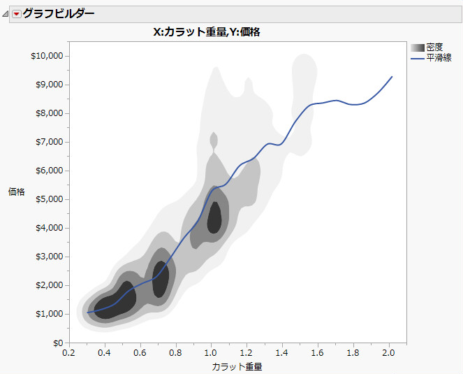データが多いほど、その領域は濃く表示されます。ダイヤモンドの特性を示した等高線図で十字ツールを使用し、以下のことを確認してみましょう。