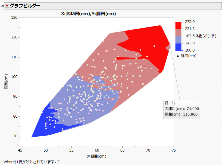 「体重(ポンド)」の凡例に示されているように、等高線の色は体重に対応しています。グラフを見ると、胴囲と大腿囲は関連していることがわかります。一方が増加すると、他方も増加しています。色分けされた等高線は、その関係において体重がどのようにあてはまるかを示しています。一般に、胴囲と大腿囲が大きな人ほど、体重も重いと言えます。しかし1人(行32)は、このパターンから少し外れているようにも見えます。