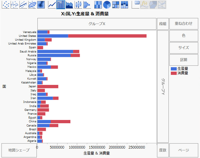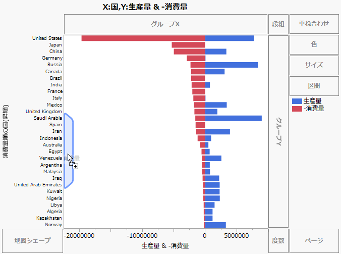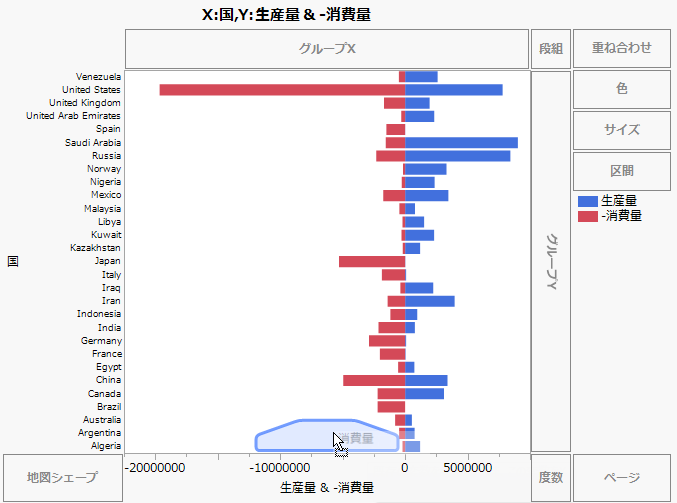 「-消費量」を選択し、X軸のすぐ上までドラッグします。「生産量」と負の「消費量」を積み重ねた棒グラフを参照してください。