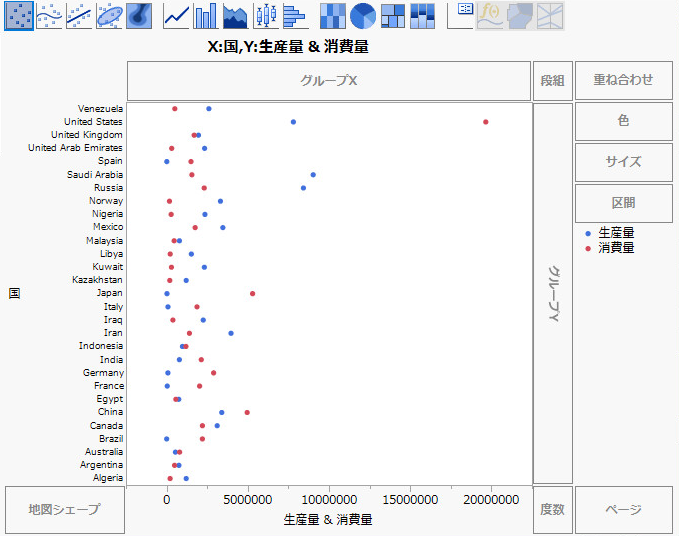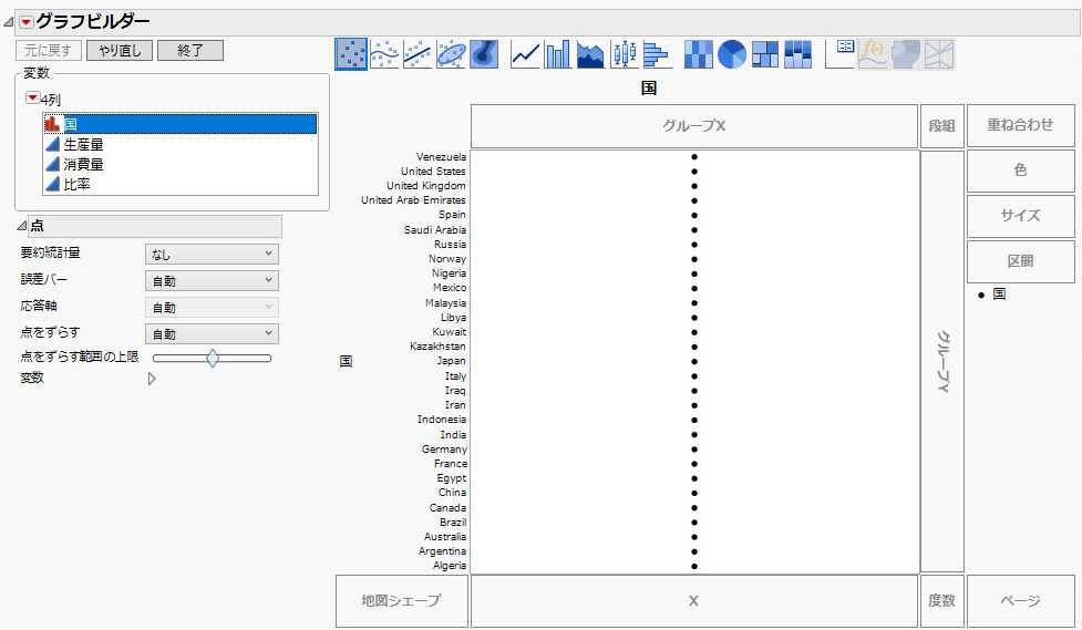 ヒント: 国は、(下から見て)アルファベットの昇順で並んでいます。値の順序を変更するには、「値の順序」または[データの出現順」プロパティを使用します。詳細については、『JMPの使用法』の「列情報ウィンドウ」章を参照してください。別の方法として、連続変数の値を使用して並べ替えることもできます。詳細については、「グラフビルダー」章の「カテゴリカル変数の水準の順序付け」(44ページ)を参照してください。