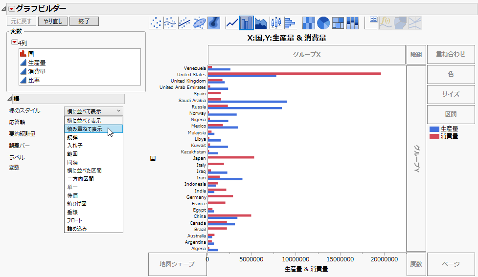 図4.10 「生産量」と「消費量」を積み重ねた棒グラフ