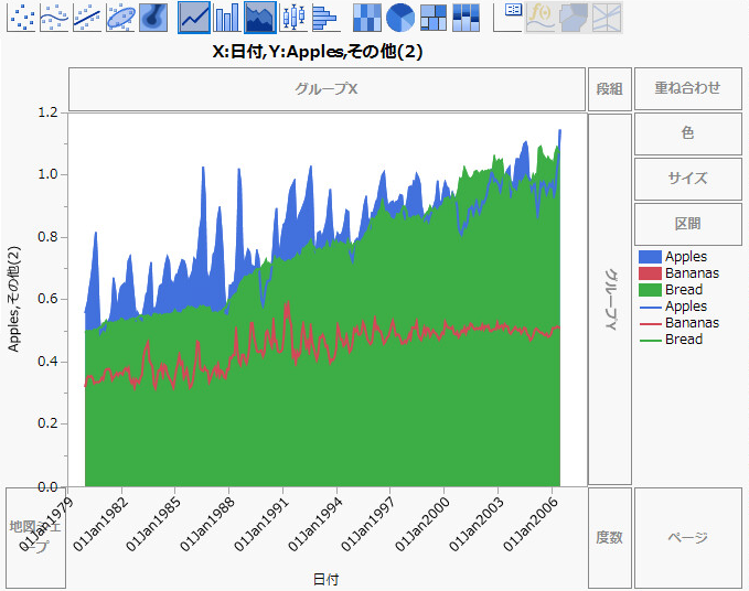プロットのレイヤの重ね合わせ順は、凡例に示されている変数の入力順と同じです。このグラフは、バナナの価格が一貫してリンゴとパンの両方の価格より低いことを示しています。平均的には、2000年まではリンゴの価格の方がパンの価格を上回っています。その後は、ほとんどパンの価格がリンゴの価格を上回っています。また、パンの価格の方がリンゴやバナナの価格より安定して増加していることがわかります。「Apples」と「Bananas」の折れ線グラフは、年ごとに上下の変動が激しく、かなり大きなギザギザになっています。
