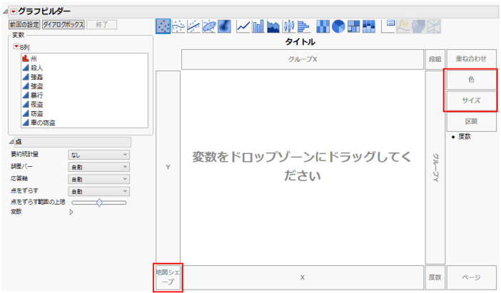 を選択して、グラフビルダーを起動します。「グラフビルダー」ウィンドウで最も重要な要素は、グラフ領域です。グラフ領域にはドロップゾーン(地図シェープ、色、サイズ)があり、変数をドラッグしてこれらのゾーンにドロップすることができます。ここから、地名を含んだデータテーブルを使い、地図シェープを作成します。