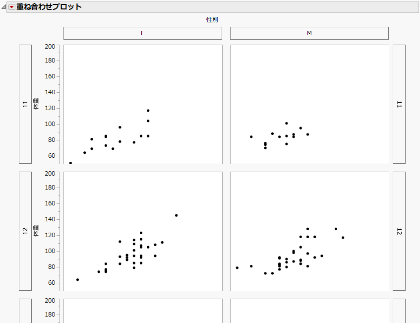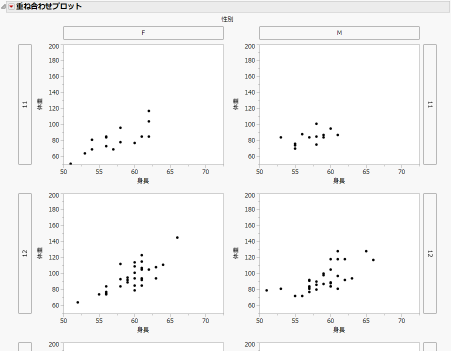 赤い三角ボタンをクリックし、開いたメニューから[軸を別々に表示]を選択し、個別の軸を使ったプロットを作成します。[軸を別々に表示]を選択していないときのプロットグループとグループ変数を比較してみましょう。