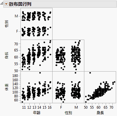 「散布図行列」ウィンドウには、二変量のグラフの行列が表示されます。個々のグラフは、2つの変数の関係を示しています。