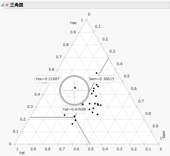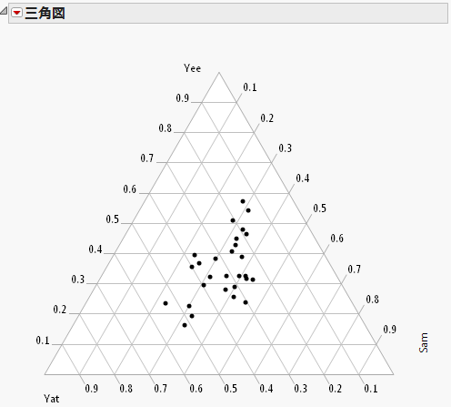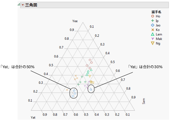 ここでは、「Pogo Jumps.jmp」データテーブルを使用します。これは、1985年の香港ホッピング選手権に参加した上位7選手のデータを脚色したものです(出典はAitchison 1986)。ホッピングでは、「yat」、「yee」、「sam」の3つの連続したジャンプの合計飛距離が測定されます。
