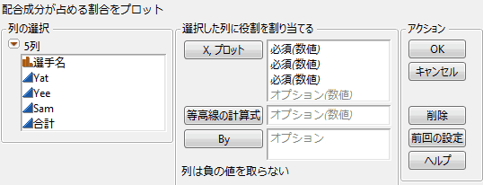 応答曲面の等高線をプロットするには、計算式の列を[等高線の計算式]に指定します。等高線の計算式として[X, プロット]に指定されていない変数が指定された場合は、プロットの下にそれらの変数の値をインタラクティブに調整するためのスライダが追加されます。第 “等高線関数を使った例”を参照してください。