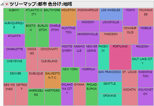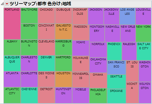 同じ地域に属する都市がすべて同じ色で表示されます。色は、JMPカラーテーマから使用されます。デフォルトのカラーテーマを変更するには、赤い三角ボタンをクリックし、開いたメニューから[カラーテーマ]を選択します。