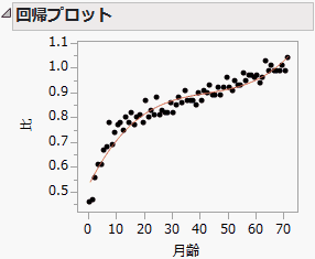 3次多項式のあてはめは、「Growth.jmp」サンプルデータに3次多項式をあてはめたときのグラフです。なお、このサンプルデータに添付されている「二変量の関係」スクリプトを実行すると、いくつかの多項式モデルがあてはめられます。
