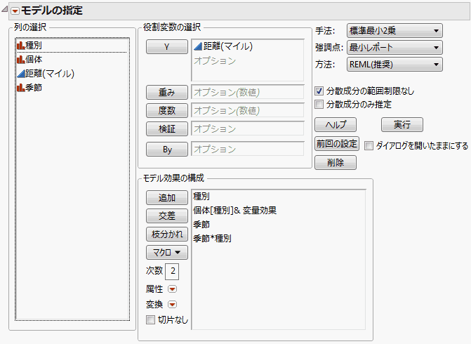 「Animals.jmp」データテーブルを開きます。このデータの「距離( マイル)」列には、6匹の動物が各季節で移動した距離が含まれています。動物の「種別」は2種類です。「個体」(各個体に対する通し番号)は、「種別」から枝分かれしています。6匹の動物はより大きな母集団から抽出されたと考えられるので、「個体」を変量効果として扱うことにします。「距離(マイル)」に対する「種別」と「季節」の影響をモデル化しましょう。