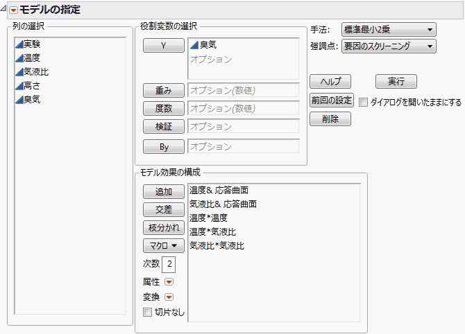 「モデルのあてはめ」ウィンドウは2因子の応答曲面モデルの指定のようになります。