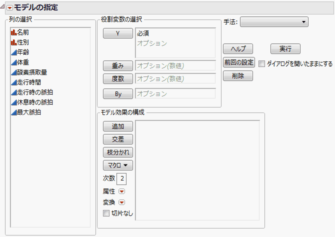 「モデルのあてはめ」起動ウィンドウには、主に次の領域があります。
