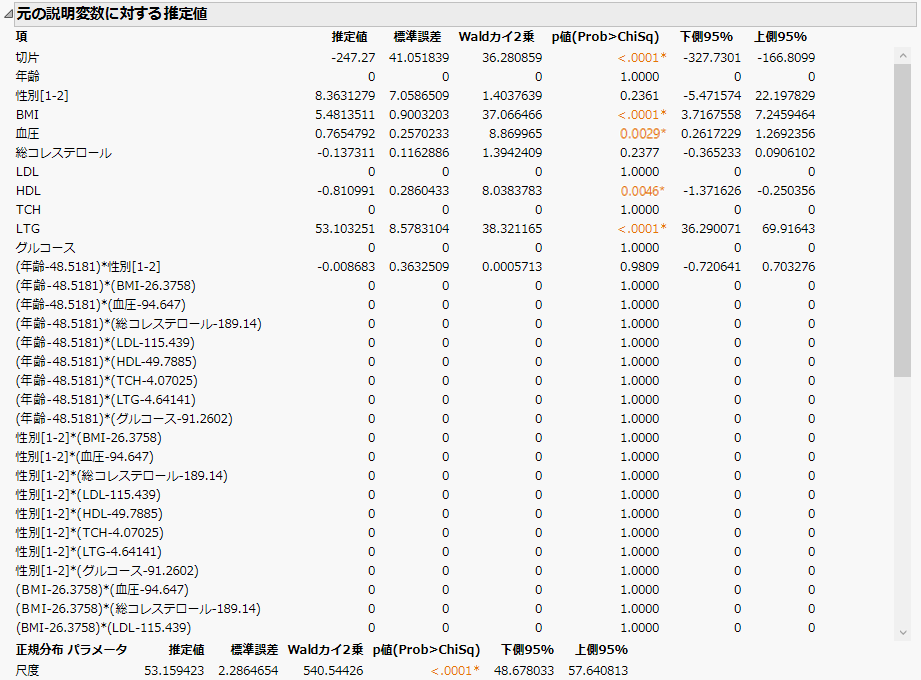 「元の説明変数に対する推定値」レポート(「元の説明変数に対する推定値」レポート(一部))と「パラメータ推定値の経路」プロットで非ゼロの項が強調表示されます。この時、データテーブルでも対応する列が選択されます。55個のパラメータ推定値のうち、ゼロでないものは7個だけです。なお、「元のデータに対するパラメータ推定値」レポートの最後の別表に表示されているのは、正規分布の標準偏差(シグマ、尺度パラメータ)です。