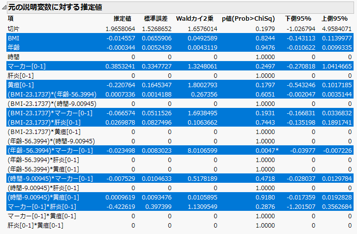 「元の説明変数に対する推定値」レポート(非ゼロの項が強調表示されたパラメータ推定値レポート)には、標準化していない元の説明変数に対するパラメータ推定値が表示されます。パラメータ推定値がゼロでない11個の項が強調表示されます。これには、交互作用の効果も含まれています。データテーブルで選択されている6つの列は、ゼロではないパラメータ推定値の項を含む列です。