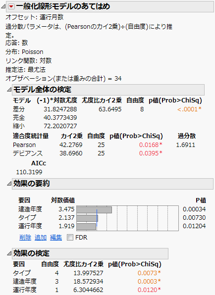 ここでは、オフセット変数として、運行月数を対数変換した変数である「運行月数」を使用します。オフセット変数は、モデルのなかで、パラメータの値を1.0に固定した説明変数として扱われます。このようなオフセット変数は、一般に、Poisson分布で対数をリンク関数とした場合、単位を揃えるために使用します。この例では、修理の回数は運行月数に比例すると予想されるので、運行月数を対数変換した変数を使います。