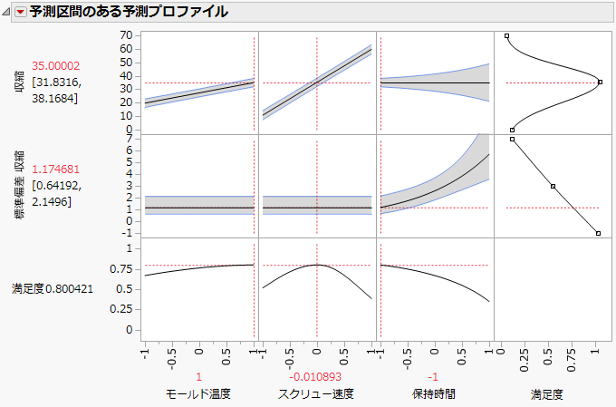 たとえば応答の平均を35程度に合わせながら、同時に、分散を最小化したいとします。モデルをあてはめ、レポートのメニューから[プロファイル]を選択します。また、平均に対する満足度関数を、31を目標値にするように変更します。 目標値に合わせ、分散を最小化するためのプロファイルと予測区間は、平均を目標値に合わせ、分散を最小化するためのプロファイルです。