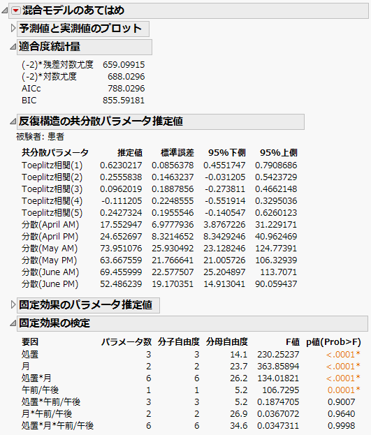 「混合モデルのあてはめ」レポート - AR(1)の共分散構造のような「混合モデルのあてはめ」レポートが表示されます。「適合度統計量」レポートを見ると、「AR(1)」モデルのAICcは652.63です。この数値を、「残差」モデルの832.55と「無構造」モデルの703.84、「Toeplitz 異分散」モデルの788.03と比較しましょう。AICc規準に基づくと、4つのモデルのうち「AR(1)」モデルが最良と言えます。