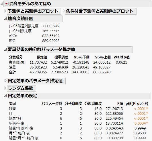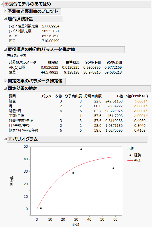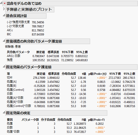 「混合モデルのあてはめ」レポート - AR(1)構造の連続時間モデルのような「混合モデルのあてはめ」レポートが表示されます。「処置」と「日数」の交互作用が有意になっています。これは、日数を説明変数とした回帰直線の傾きが、薬剤によって異なることを示しています。