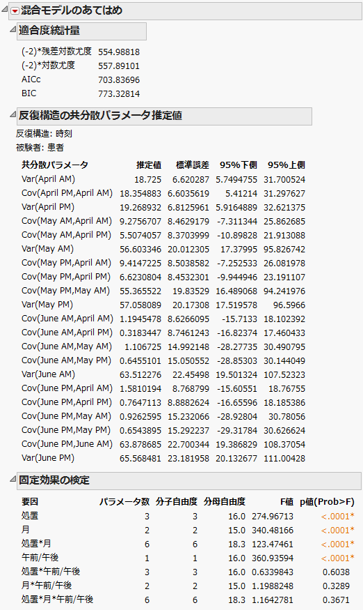 「混合モデルのあてはめ」レポート - 無構造の共分散構造のような「混合モデルのあてはめ」レポートが表示されます。3つのモデルをAICcまたはBICを使って比較したいので、「適合度統計量」レポートを見てみましょう。無構造モデルのAICcは703.84です。