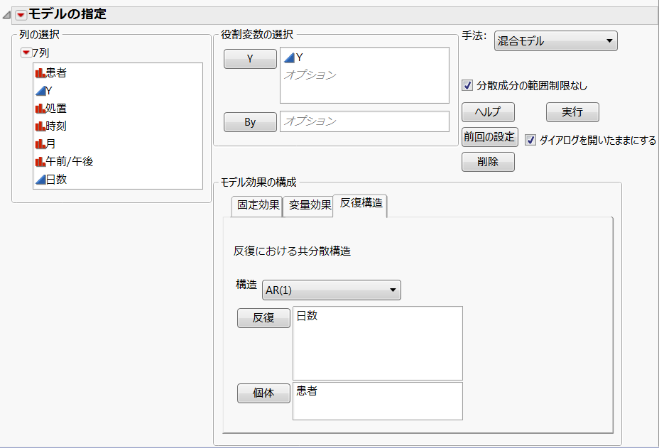 積み重ねたデータテーブルの「日数」列では、実験の開始日から測定日までの経過日数が、計算式によって算出されています。この列は連続尺度になっています。共分散構造としてAR(1)を使う場合、時点を表す列は連続尺度でなければなりません。