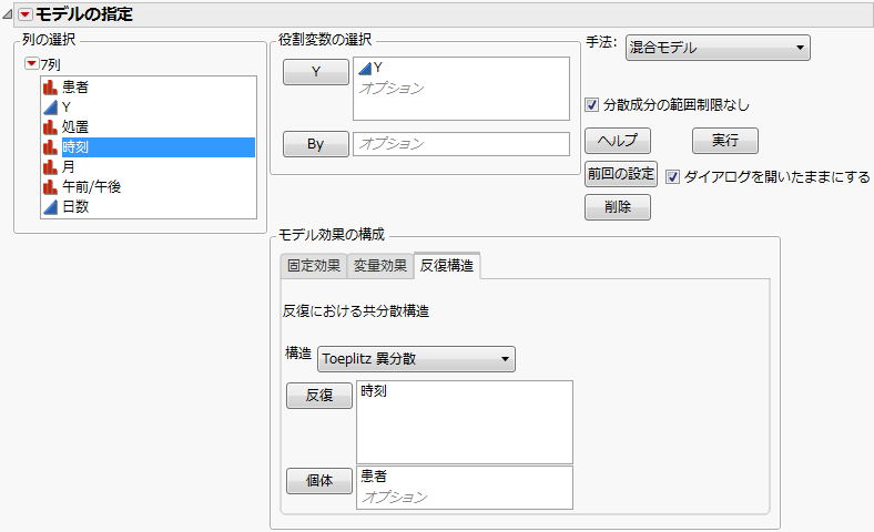 [混合モデル]手法には、さまざまな共分散構造が用意されています。反復測定データは、Toeplitz分散構造や1次自己相関(AR(1))の共分散構造に従っている場合がよくあります。これらの構造は、多くの反復測定データの特徴をよく捉えていると同時に、推定するパラメータ数が少なくて済みます。AR(1)構造やToeplitz構造は、各時点での分散が同じであると仮定します。一方、異分散Toeplitz構造は、時点ごとに異なる分散を仮定します。第 “反復共分散構造の要件”を参照してください。