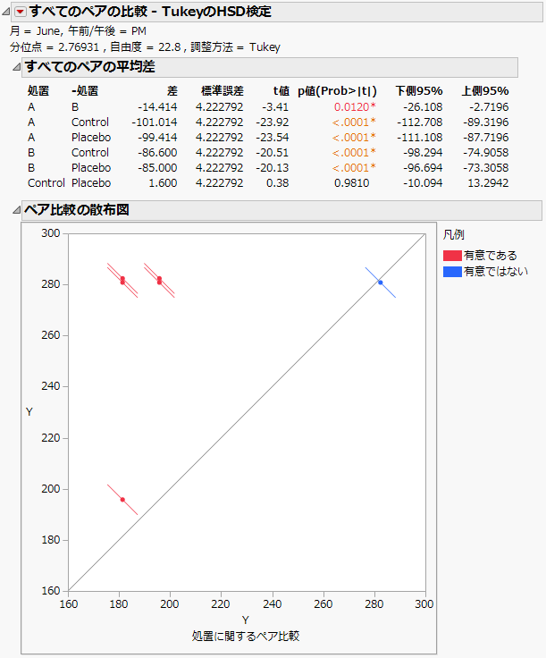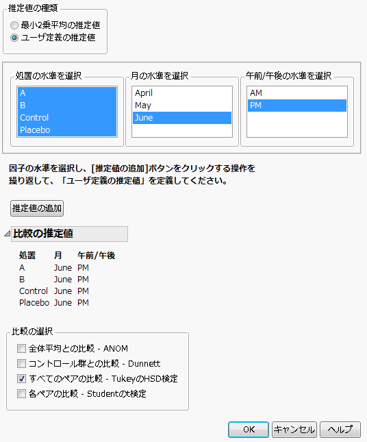 「比較の選択」リストで、[すべてのペアの比較 - TukeyのHSD検定]を選択します。