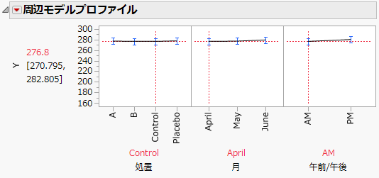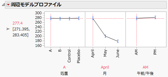 「月」のプロットで点線を「April」から「June」へとドラッグすると、処置が「B」の場合の「AM」におけるYの平均予測値が「April」の276.8から「June」の191.2へと下がることがわかります。