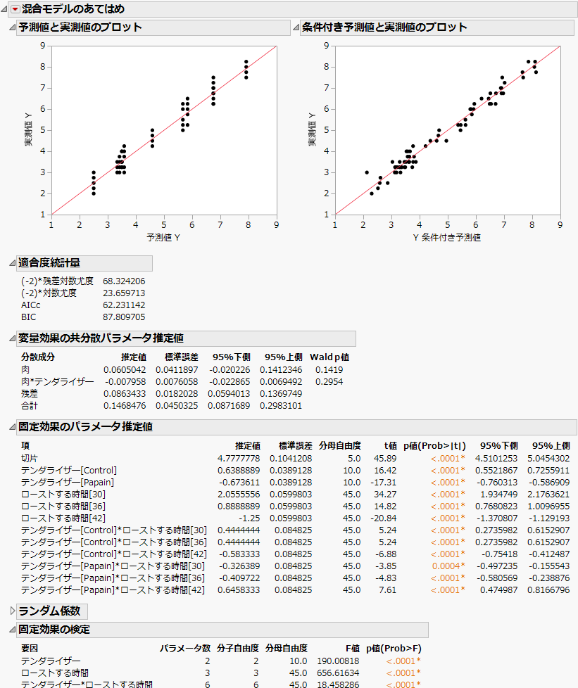 「混合モデルのあてはめ」レポートのような「混合モデルのあてはめ」レポートが表示されます。