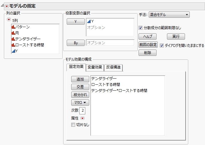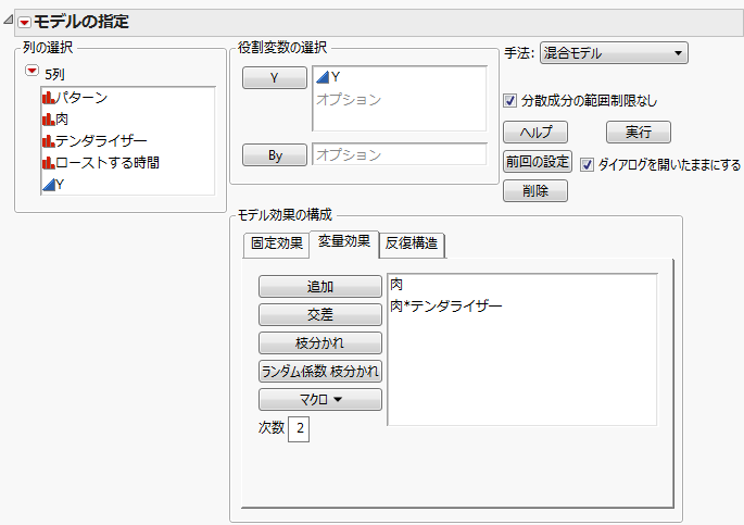 「テンダライザー」と「ローストする時間」を選択して、[マクロ]>[完全実施要因]を選択します。