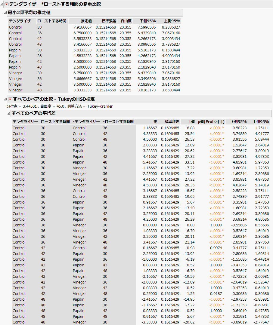 ロースト時間が30分のときの周辺モデルプロファイルのすべてのペアに対する検定結果を見ると、テンダライザーの「Papain」(パパイン)と「Vinegar」(酢)の両方とも、ロースト時間が30分や36分のときは、コントロール群よりも硬さが有意に低いことがわかります。この検定結果では、42分においては差は有意ではありません。48分では、パパインはコントロール群より低い値を示していますが、酢はそうではありません。パパインの硬さは、42分のときを除き、常に酢よりも低くなっています。