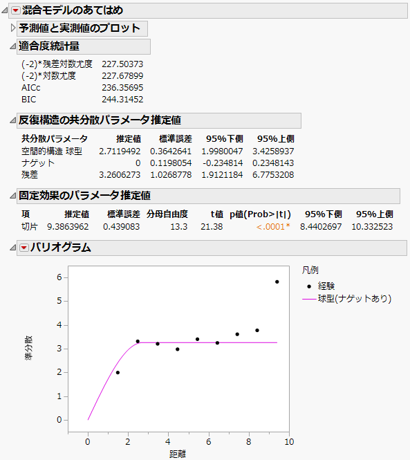 「混合モデルのあてはめ」レポート - ナゲット効果ありの球型空間的構造のような「混合モデルのあてはめ」レポートが表示されます。対数尤度はナゲットのない球型空間モデルのものと同じです。AICcは少し高くなっています(234.08に対して236.36)。「反復構造の共分散パラメータ推定値」レポートを見ると、「ナゲット」共分散パラメータ推定値はゼロになっています。現在のデータには、ナゲット効果が存在するという証拠は見当たりません。