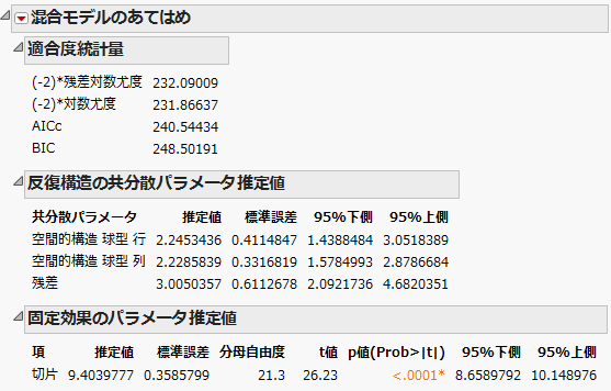 「混合モデルのあてはめ」レポート - 異方性球型の空間的構造のような「混合モデルのあてはめ」レポートが表示されます。AICcを見ると、等方性の球型モデルに比べて、異方性の球型モデルは良くないようです(AICcは234.08に対して240.54)。「反復構造の共分散パラメータ推定値」レポートを見ると、「行」の推定値(「空間的構造 球型 行」)と「列」(「空間的構造 球型 列」)の推定値は非常に近い値になっています。現在のデータには、行と列とで空間相関が異なることを示す証拠はありません。