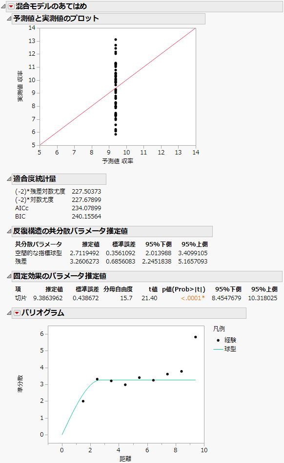 「混合モデルのあてはめ」レポート – 空間的球型構造のような「混合モデルのあてはめ」レポートが表示されます。「予測値と実測値のプロット」を見ると、予測値は1つの値しか取っていません。これは、切片だけの空間モデルがあてはめられたからです。「適合度統計量」レポートを見ると、「(‐2)*対数尤度」は227.68で、AICcは234.08になっています。