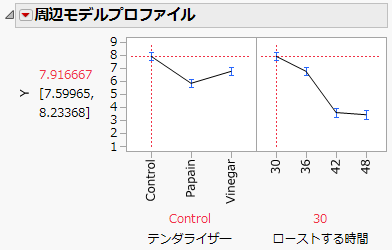 分析結果は、プロファイル・曲面プロット・等高線図などの動的なグラフでも表示できます。これらのグラフは、モデルをより理解するのに役立ちます。プロファイルについての詳細は、『プロファイル機能』を参照してください。
