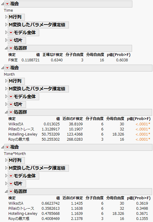 「時間」のレポートを見ると、「時間」と「処置群」の交互作用のp値は0.6038であり、交互作用が有意でないことを示しています。つまり、「処置群」の間に見られる差の時間(午前/午後)による変化は有意でありません。「時間」には水準が2つ(「午前」と「午後」)しかないため、正確なF検定が計算されています。