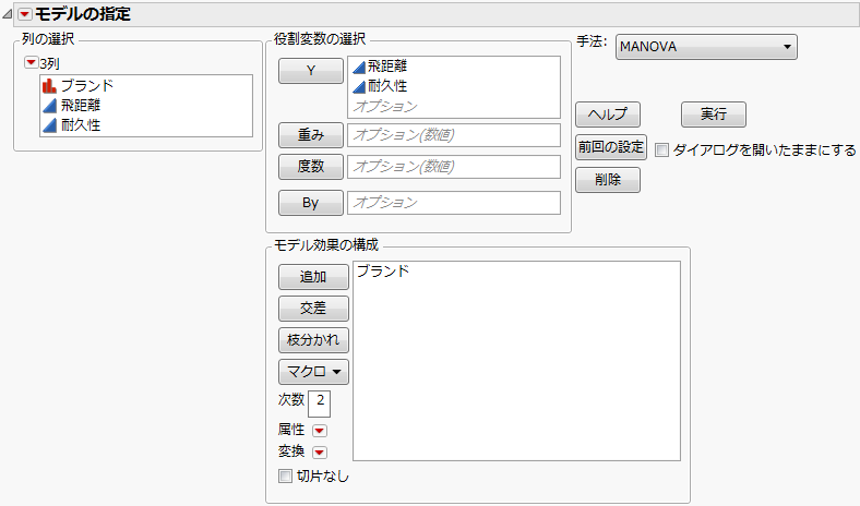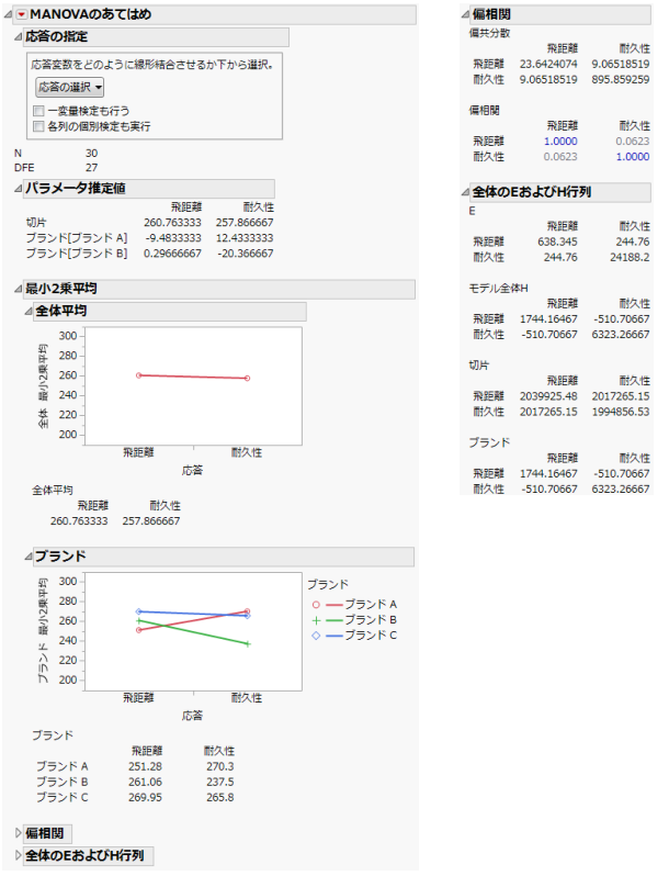 ここでは、「Golf Balls.jmp」サンプルデータ(McClave and Dietrich 1988)を使います。このデータは、3つのブランドのゴルフボールを調べ、その飛距離と耐久性を比較したものです。無作為抽出した各ブランドのボール10個ずつを、ランダムな順序でロボットが打ちました。検定したい帰無仮説は、「ボールの飛距離と耐久性は、どのブランドでも同じ」というものです。
