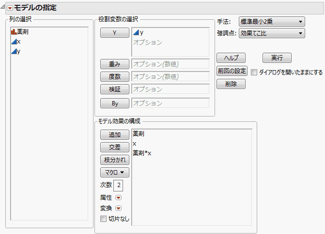 「薬剤」と「x」を選択します。「列の選択」リストでこの2つの効果を強調表示したまま、[マクロ]をクリックして[完全実施要因]を選択します。この操作により、これら2つの効果と、これらの2因子間交互作用が「モデル効果の構成」リストに追加されます(入力が完了した「モデルのあてはめ」起動ウィンドウ)。